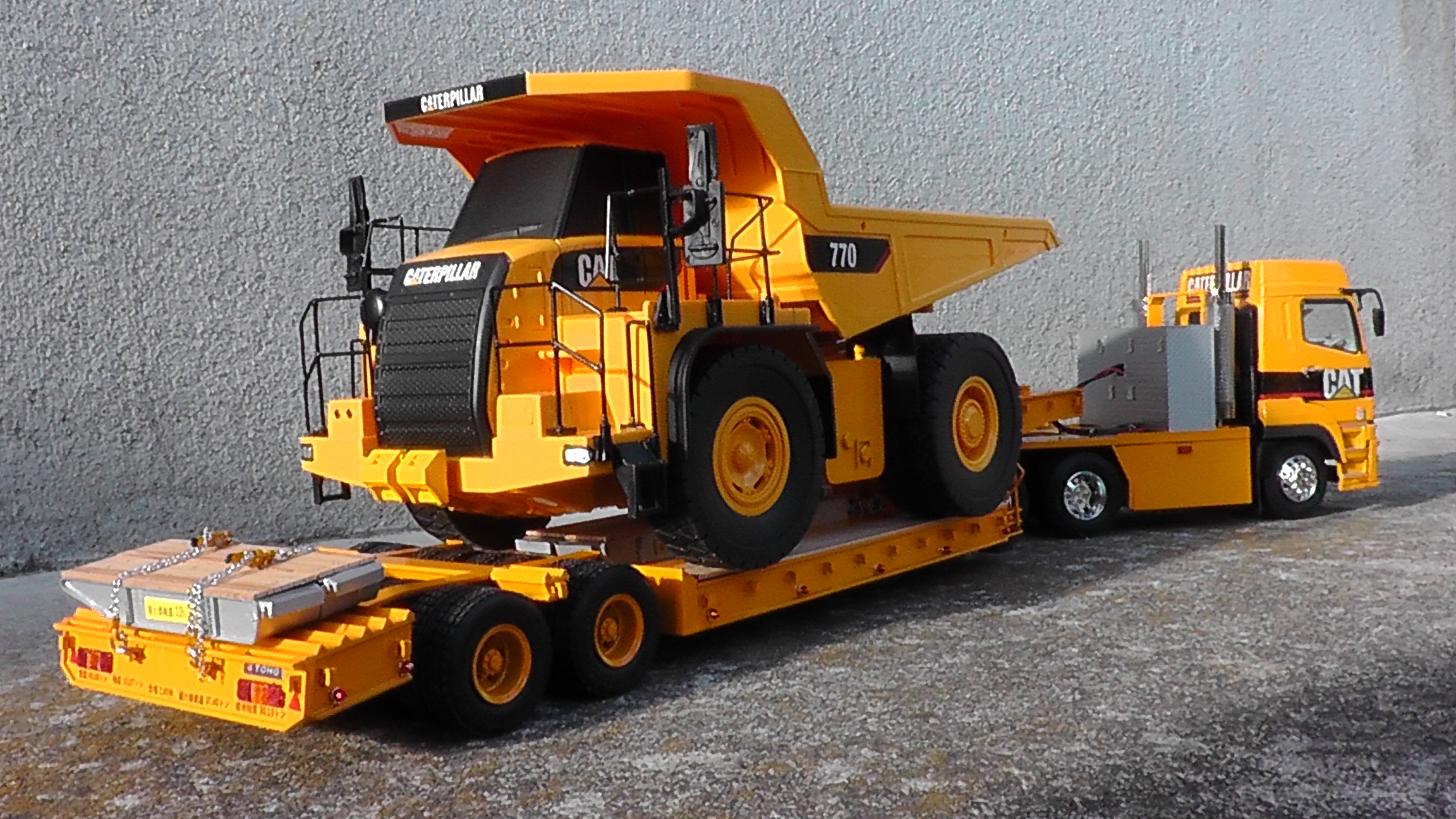 積荷のブルドーザーは新車輸送時姿と、お役御免になった自走不能の姿を表現しました